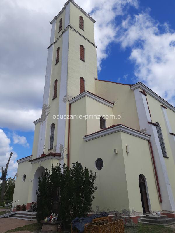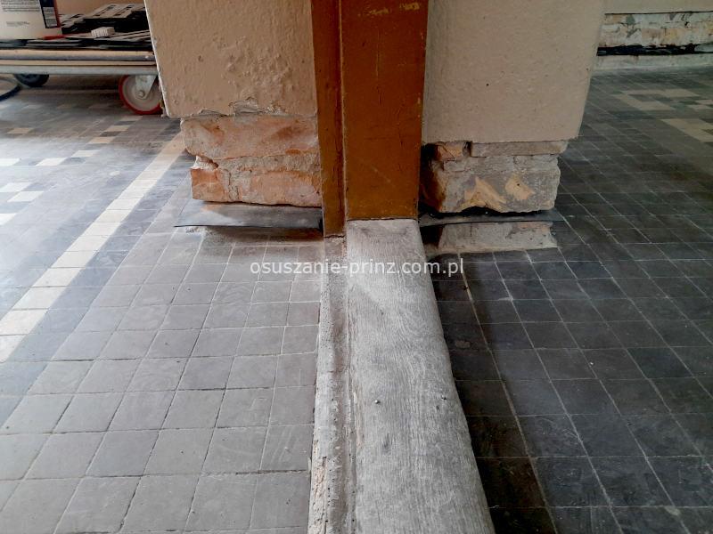 Stuletni kościół z fundamentem z czerwonej cegły - problem z podciąganiem kapilarnym, pierwotna izolacja została uszkodzona przez upływ czasu.
